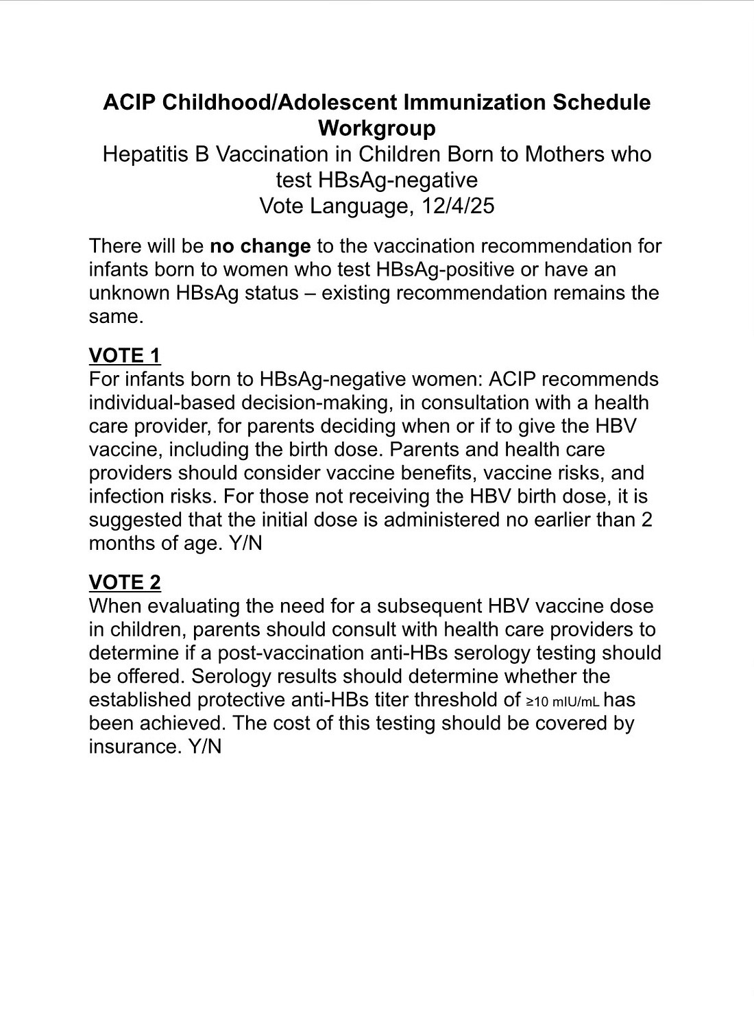 The language approved in Vote 1 is quite nuanced. This only addresses infants born to mothers documented not to have Hepatitis B virus infection. As promised by Secretary Kennedy, no one has had their ability to obtain a government-subsidized HBV vaccine taken away.