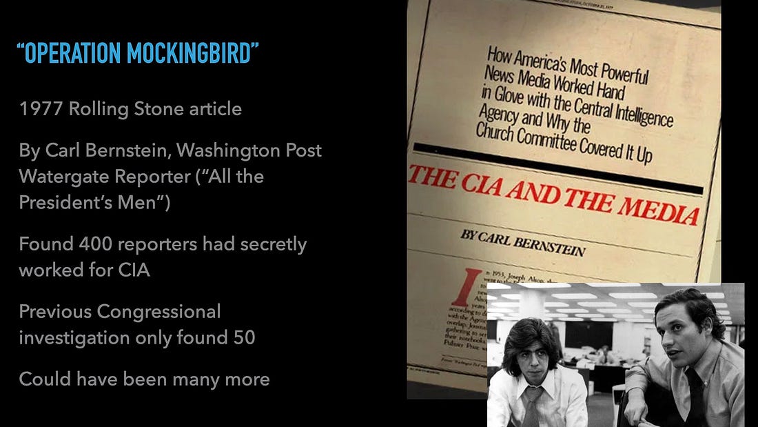 The CIA and the intelligence community have controlled or sought to control the media discourse for the last 80 years. In 1977, Carl Bernstein, the famous Washington Post reporter who uncovered Watergate, discovered that 400 reporters had been secretly working for the CIA. A previous congressional investigation had only found 50 of them. In truth, there could have been many more.