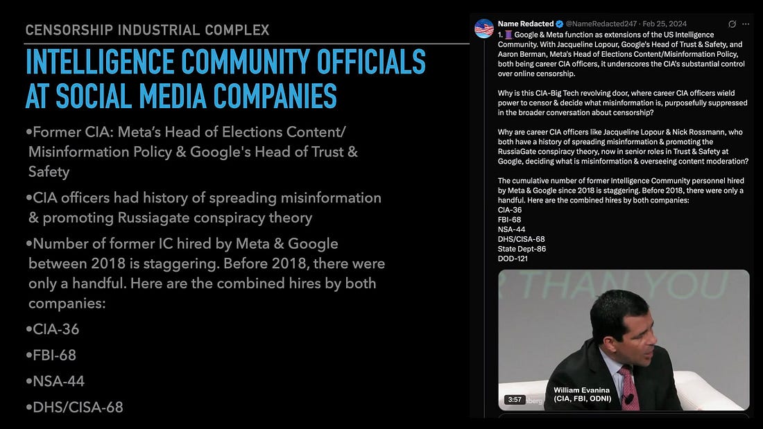 We now know that between 2018 and 2023, there were 36 people from the CIA 68 from the FBI 44, from the National Security Administration and 68 from the Department of Homeland Security who had moved to work at the social media platforms.
