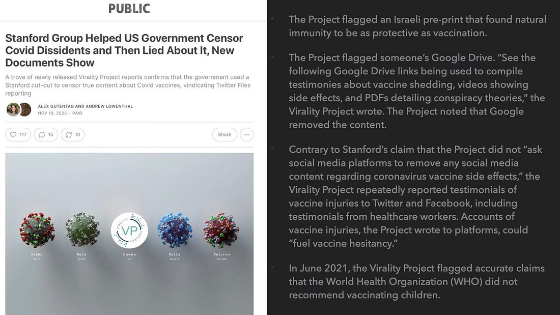 Contrary to Stanford’s claim that the project did not ask social media platforms to remove any content, they privately said they did. And we know that many hundreds of thousands of tweets and Facebook posts were removed, even though they were a hundred percent accurate. In fact, in 2021, Stanford’s “Virality Project” flagged accurate claims that the World Health Organization did not recommend vaccinating children.