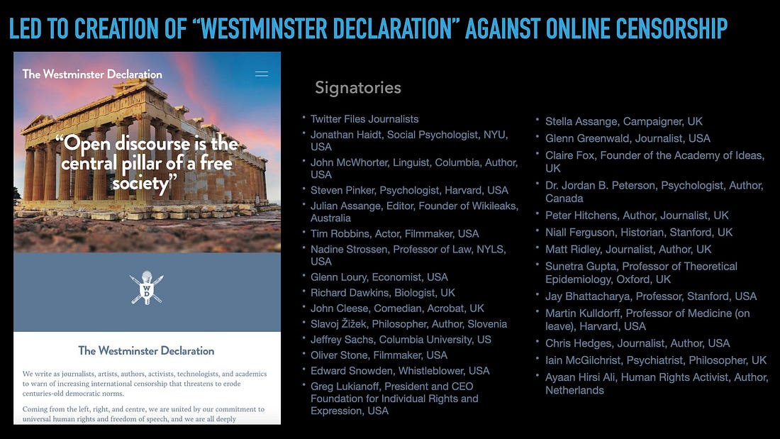 The good news is that we have tools at our disposal. One is the Westminster Declaration against censorship. Another is sunlight, the best disinfectant. We need to expose these guys and make them famous. And we Americans and Europeans need to work together to fight censorship. We were able to shut down at least one of the Stanford censorship think tanks by shaming it out of existence.