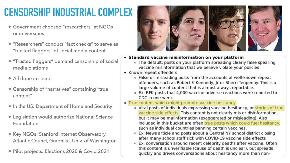 They’re looking to censor narratives. This is essential because, as decades of good cognitive science have shown, people understand and retain information through storytelling. We think in terms of stories, not bullet points. And so they were out to censor whole narratives. From the Stanford censorship project on COVID, the “Virality Project,” they said they wanted to censor “true stories” of vaccine side effects.
