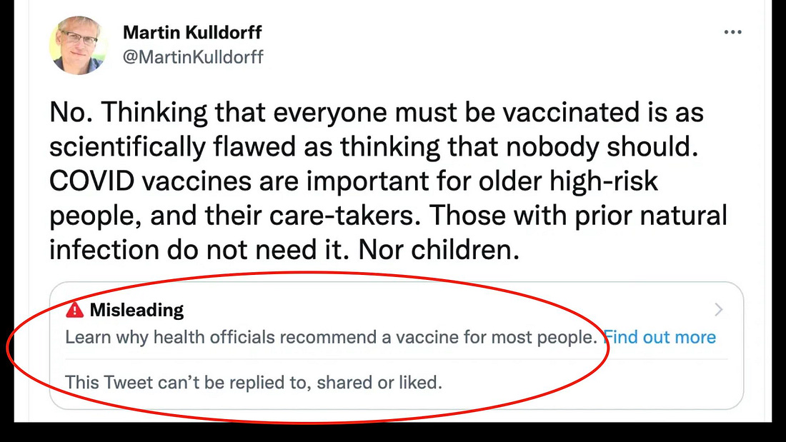 And yet Twitter censored Martin Kulldorff’s tweet. “Learn why health officials recommend a vaccine,” read a warning that Twitter employees put on it. For most people, the Tweet cannot be replied to, shared or liked. In other words, Twitter had decided that this professor at Harvard Medical School was wrong, and that natural immunity wasn’t really something that could protect you from COVID.