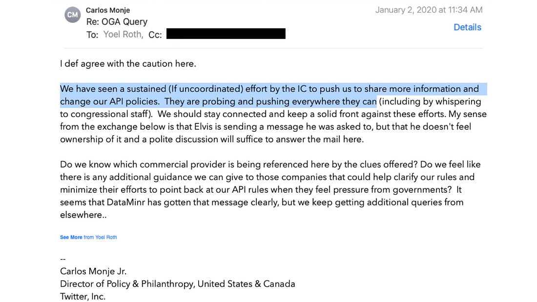 It’s from the director of policy at Twitter. “We have seen a sustained if uncoordinated” — supposedly — “effort by the intelligence community to push us to share more information and change our API policies. They’re probing and pushing everywhere they can.