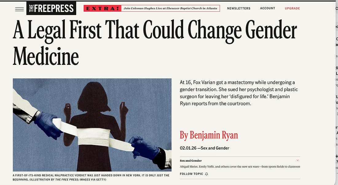 The news that the first detransitioner, Fox Varian, won her lawsuit went viral a few days ago. I kept waiting for it to become major news at the New York Times, NPR, or the Washington Post. And yet, when I do a search, very few sources pop up, one of them being the Free Press:
