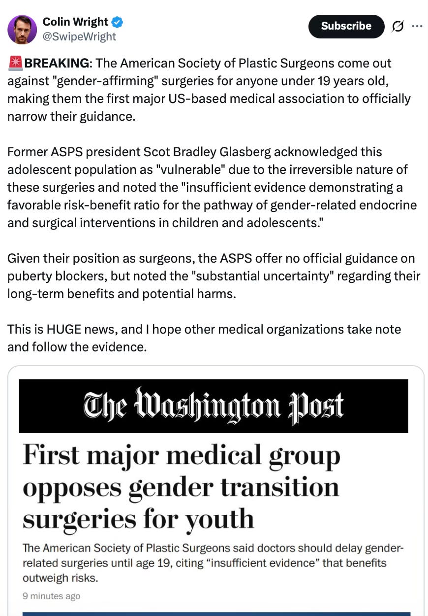I knew this day was coming. There is no way any society can get away with chemical and surgical castration on minors, along with amputating healthy breasts off of teenage girls who have no idea what they’re getting into.