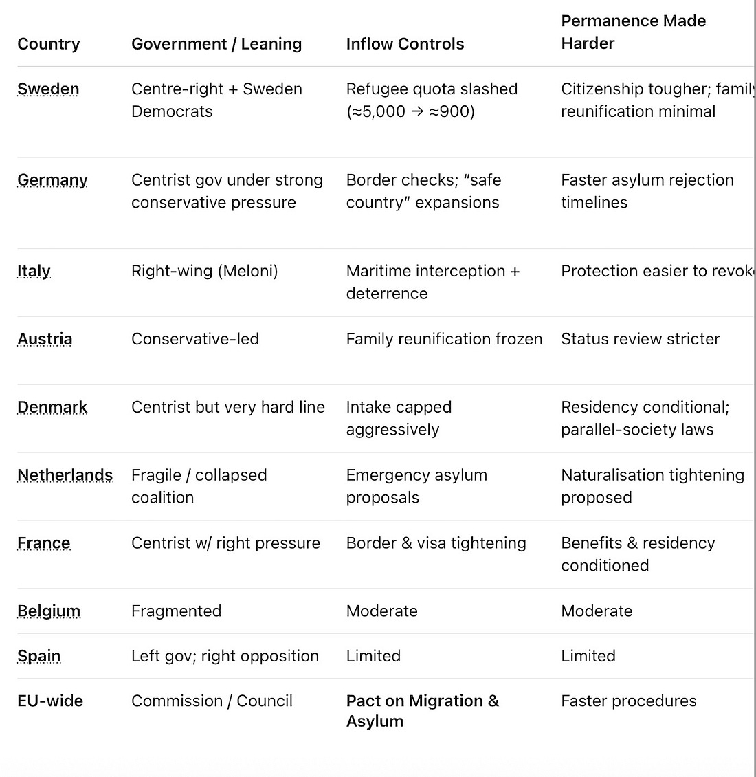 Return hubs were initiated by the EU in March of 2025, and subsequent legislation sped procedures, set obligations and tools and specifically enabled return hubs. Sweden in the last month has dramatically increased financial repatriation assistance. Criminals and those here illegally are the first to go, of course, but legal immigrants are being strongly encouraged to repatriate.