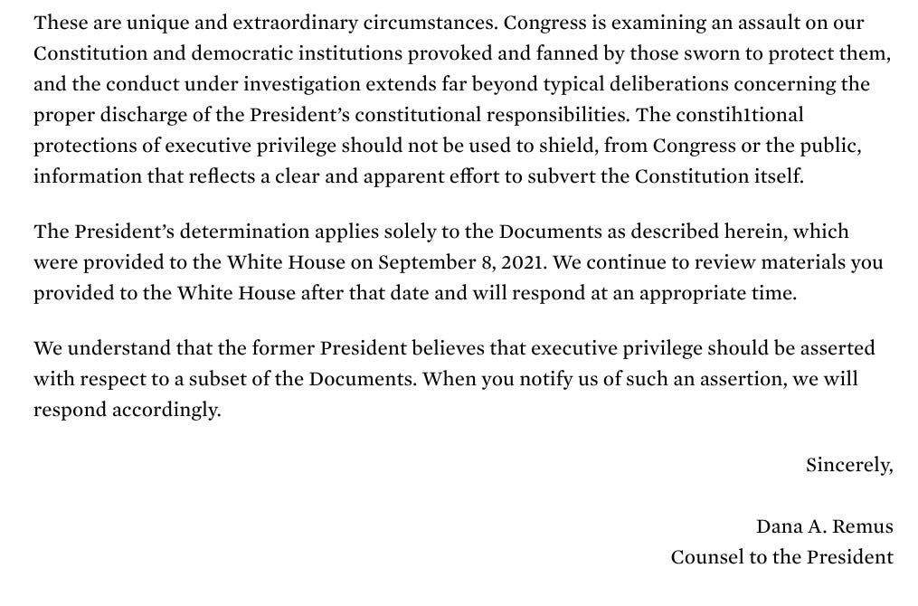 White House counsel David Warrington quickly informed the Archives that “President Trump has determined that an assertion of executive privilege is not in the best interests of the United States,”—the exact same words Remus had used in 2021.