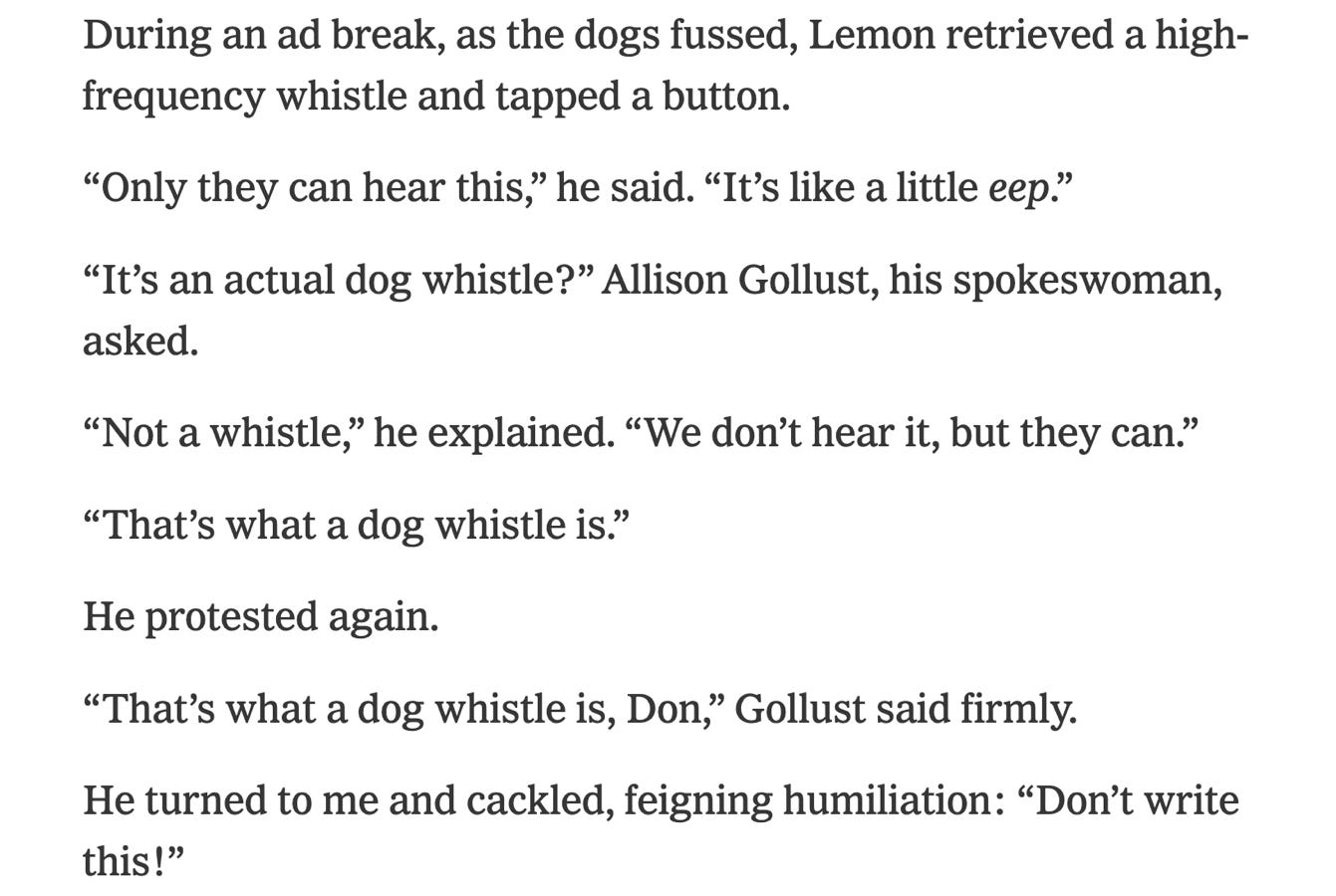 🍋 The man who spent years on CNN calling everything Trump did a “dog whistle” does not, the article reported, understand what a dog whistle literallyis. When his own spokeswoman tried to explain that the ultrasonic device he uses on his dogs is, in fact, a dog whistle, Lemon protested. She had to tell him twice. “That’s what a dog whistle is, Don,” she said firmly. He turned to the reporter and begged, “Don’t write this!” The reporter wrote it.