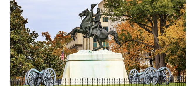 The fountains flank one of the strangest visual juxtapositions in Washington: a flamboyant equestrian statue of Andrew Jackson on a horse balancing only on its hind legs —the first of its kind in the world— surrounded by calm lawns and modest fountains. (Historical note: the statue’s 1853 artist, Clark Mills, had never seen an equestrian statue before. He worked with horse cadavers and his own stallion —named Olympus— to figure out the balance. At the dedication, he threw his own body against the front legs to prove it wouldn’t fall.)